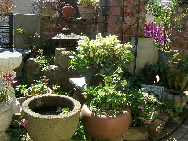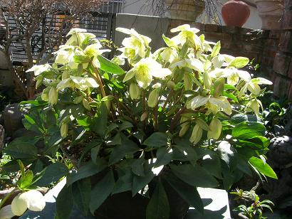 早速予約日の晴天の早朝、約束の9時半にお邪魔した。朝9時半は少し早くてお邪魔かもしれないが、花は早朝が一番美しいこと、朝の斜めの柔らかい光が花を一番美しく見せることを説明して、花好きな人なら必ず理解してくださるはずだということを知っての頼みだ。一般の住宅街の中で、一見してガーデニングをしているお宅とすぐに見分けがつく庭だ。小高い南の角の日当たりの良い庭だった。小じんまりした庭にアンティーク調の鉢に植えられたクリスマスローズが庭一面に咲き誇っていた。