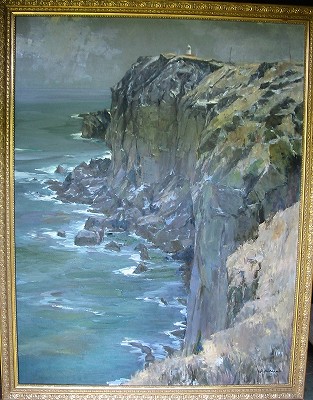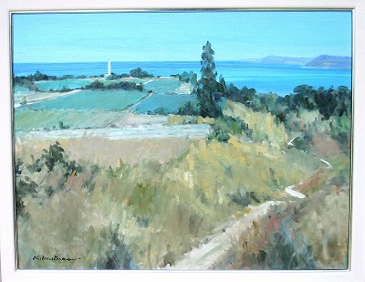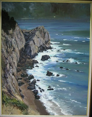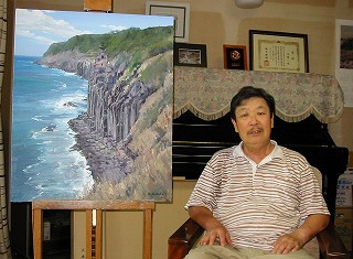 佐鳴台5丁目にお住まいの犬塚さんが絵を始めたのは60歳になってからだという。月並みに定年後に何を始めようかいろいろ迷ったそうだ。木彫りのクラフトをやってみたり、釣りをも考えたけれど、年齢を重ねても出来る物をと、本格的に描いたことは無かったけれど若い時から好きだった絵を描く事にした。絵を描くのなら基本からしっかり勉強しようと、服部譲司先生に師事を仰ぎ油彩画を勉強した。 早くも今年で10年、努力と才能が開花して、数々の賞を受賞するほどの素晴しい活躍ぶりである。犬塚さんの絵は一貫して「岬と灯台」のテーマが多い。「どうしてですか?」と尋ねたら、若い頃よく行った伊良湖岬の思い出があったり、日本は島国で岬が多いこと、岬には必ず灯台があって、そんな灯台も今は無人化されて時代を感じていること、余り他の人が描いていないこと・・・・などの理由で自分のテーマにしているという。