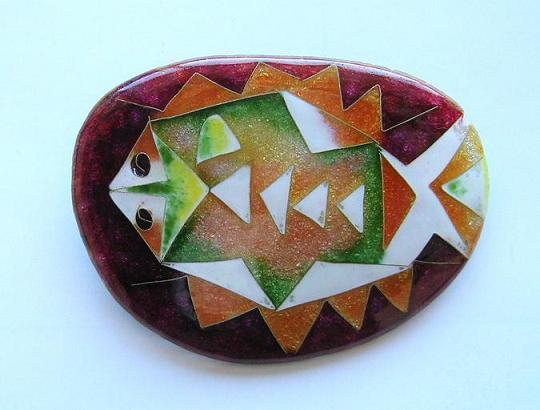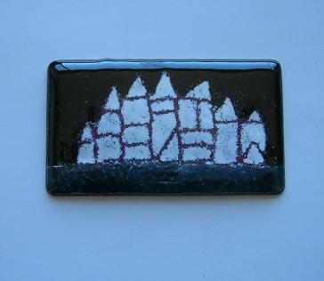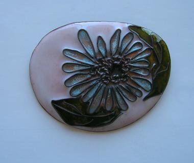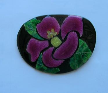 今まで制作した数々の作品を見せていただき、何点か写真に撮らせていただいたのでご鑑賞ください。なかなか美しいものです。装飾品としては素晴らしく、もっと皆さんに関心を持ってもらっても良いのではないでしょうか。家庭用の電気炉は容量が小さいので、大きなものは製作が難しいとのことですが、ブローチに限らず、箸置き、壁に飾る小さな絵、バッグにつける飾りなど、日常生活に使えるものが良いような気がします。固定観念にとらわれないで、いろいろな利用法を考えたらいかがでしょうか、と話が弾みました。(2008・2・25)