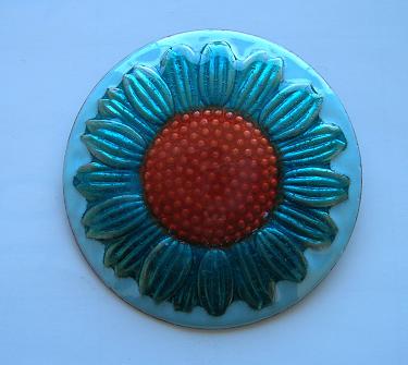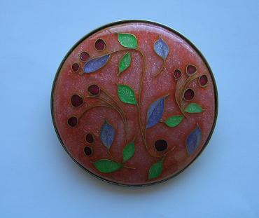 以前はもっと人気があって盛んだった七宝焼も、最近は健康指向のテーマに関心が移ってしまったのか、七宝焼きの人気はそれほどでもなくなってしまったと残念そう。七宝焼きのブローチは素材が金属とガラスなので重く、最近の洋服の生地は薄手が多いのでどうしても垂れ下がってしまうのが欠点で、これも不人気の原因かも、とおっしゃっていました。手で持ってみたが、確かに手ごたえのある重みを感じた。