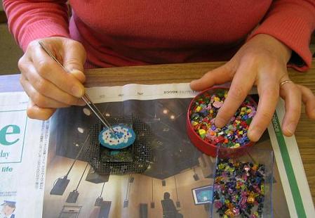 お話を伺いながら会員の方が製作されている過程を見ることができました。銅板の台の上に釉薬を塗り、その上にガラスの粒を置いて模様を描いていました。指先の細かい作業なので、年齢と共に大変な作業のようです。これを電気炉に入れて焼くのですが、予想とは違った仕上がりになったり、思いがけない素晴らしい色が出たりするところが楽しみでもあるようです。焼きあがった作品を見て、思っていたより白い色が大きく溶けてバランスが悪くなってしまった、と反省していました。